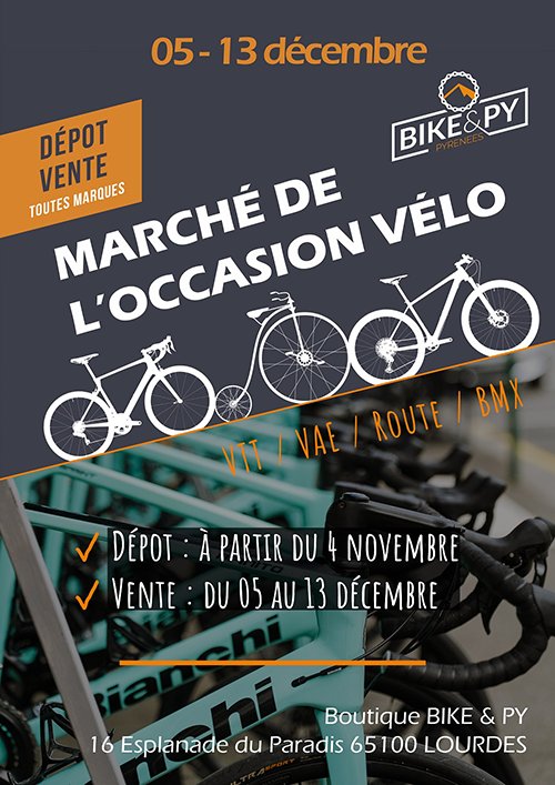 Dépôt des vélos : du 4 novembre au 3 décembre 2025, directement au magasin Bike & Py (16 Esplanade du Paradis, Lourdes). Chaque vélo est obligatoirement révisé pour 35 € afin de garantir sa sécurité et son bon fonctionnement.