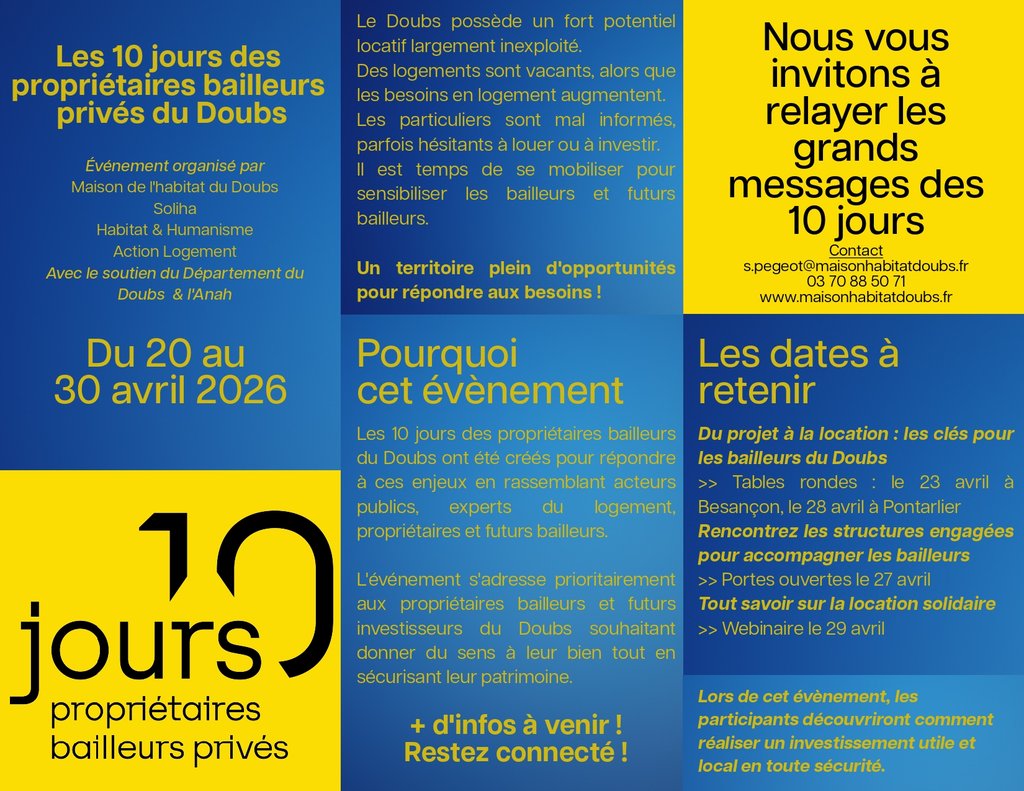 - Tables rondes « Du projet à la location : les clés pour les bailleurs » : le 23 avril à Besançon à la CCI et le 28 avril à Pontarlier dans les locaux de la CCGP