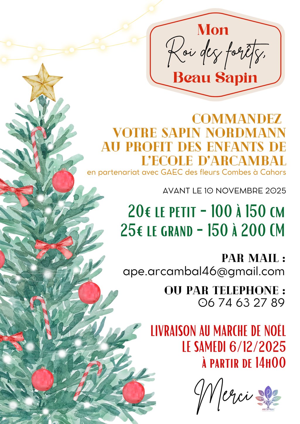 L'APE de l'école Claude Murat d'Arcambal vous offre la possibilité de commande votre sapin Nordmann.