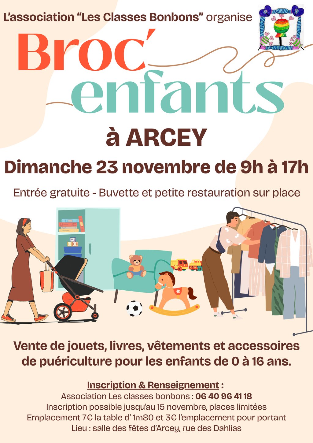 L'association Les Classes Bonbons d'Arcey organise son 1er Broc'enfants le dimanche 23 novembre de 9h à 17h à la salle des fêtes.
