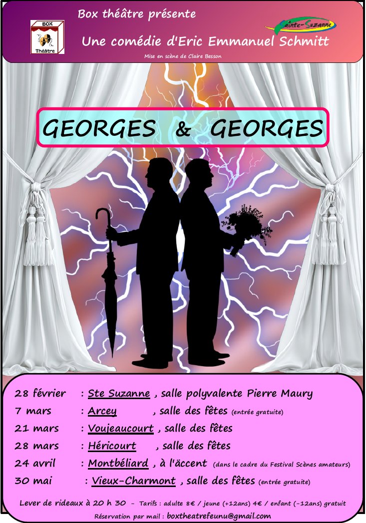 Une représentation est prévue le SAMEDI 07 MARS 2026 à 20h à la salle des fêtes d'Arcey. La pièce s'intitule "Georges et Georges" d'Eric-Emmanuel Schmitt. S'agissant d'une comédie, le rire est, en principe, garantit ! L'entrée est libre (pas de réservation). La troupe sera rémunérée "à la corbeille". On vous attend nombreux pour passer un bon moment, loin des soucis du quotidien...