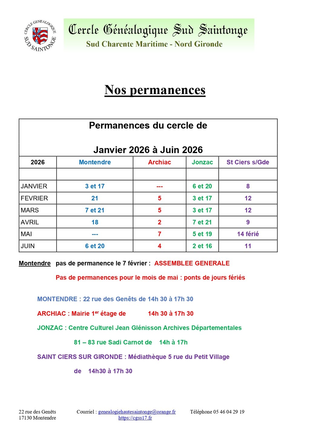 CERCLE GENEALOGIQUE - PERMANENCES