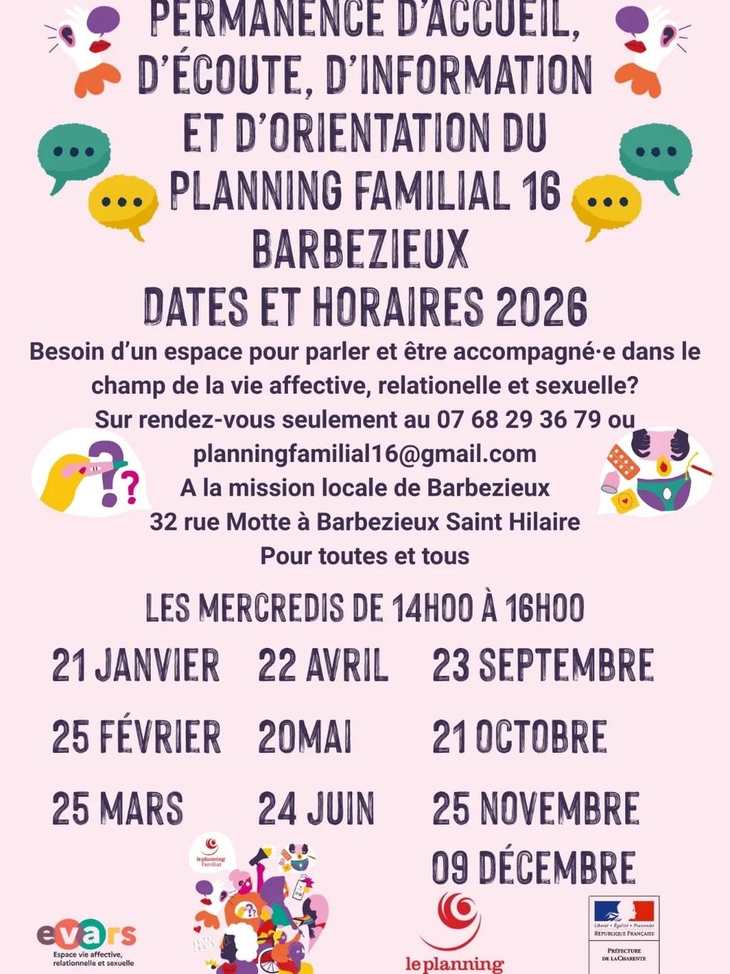 Sur rendez-vous au 07 68 29 36 79 / planningfamilial16@gmail.com