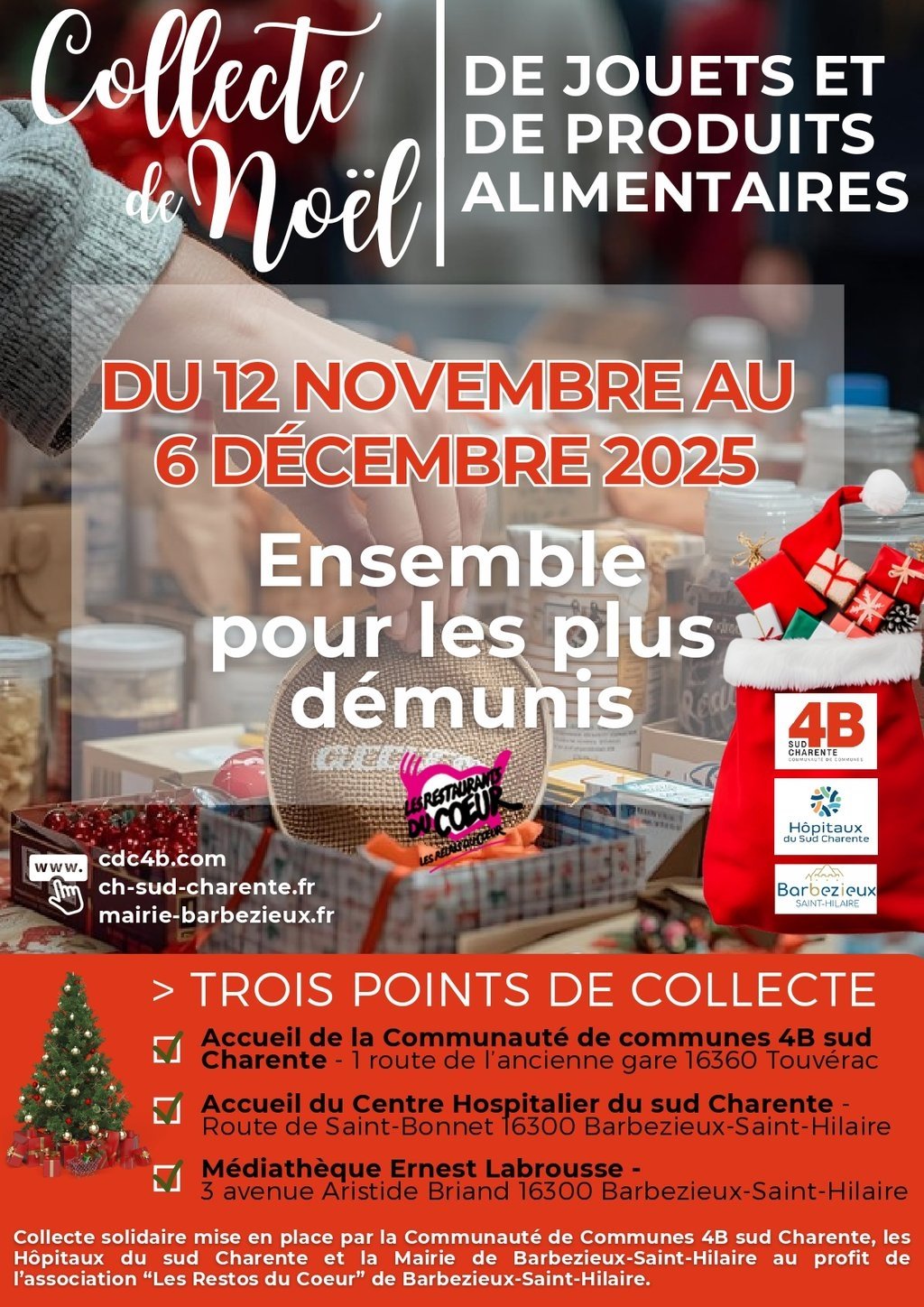 Du 12 novembre au 6 décembre 2025, la Communauté de communes 4B sud Charente, les Hôpitaux du Sud Charente et la Mairie de Barbezieux-Saint-Hilaire organisent une collecte «Noël solidaire» sur l’ensemble du territoire.