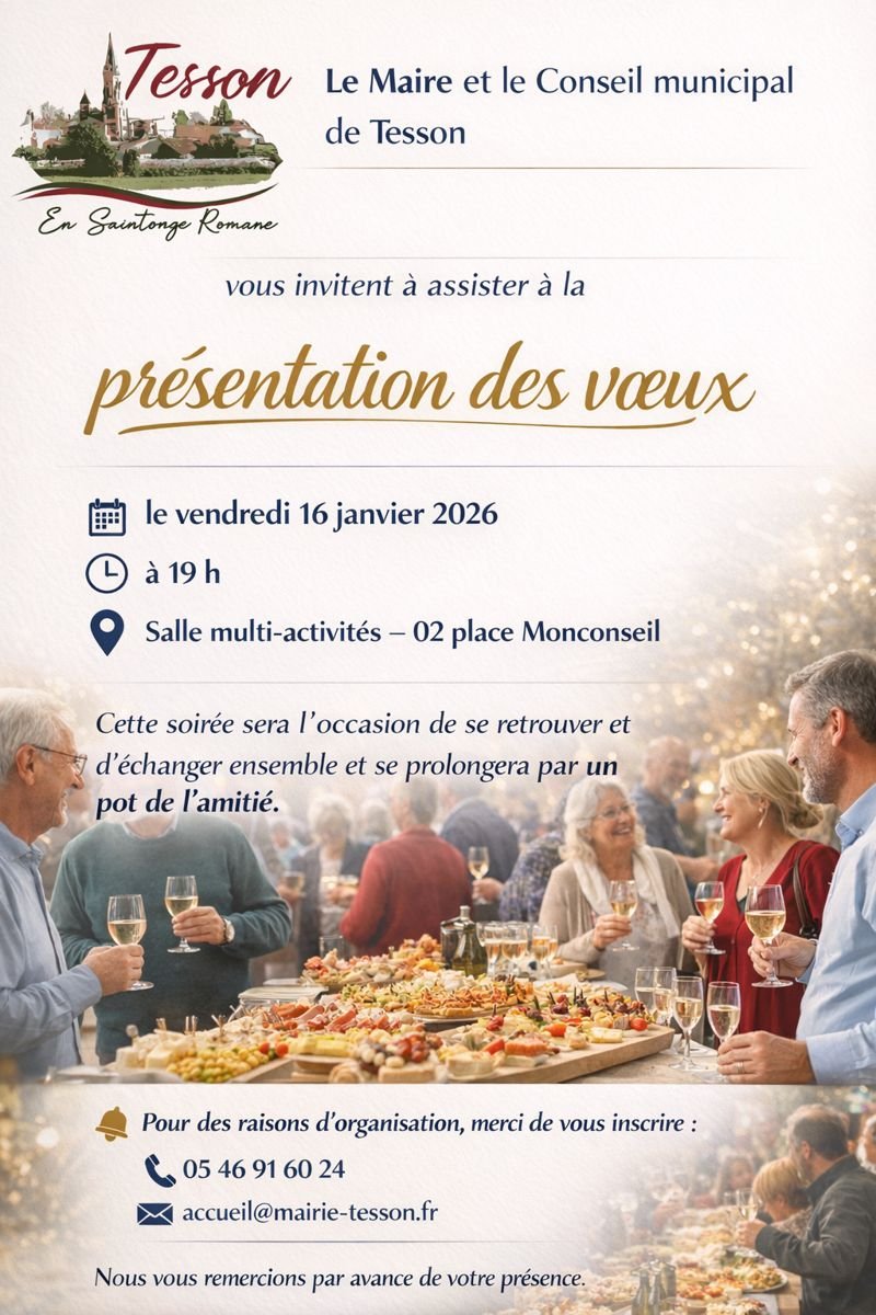 Le Maire et le Conseil municipal de Tesson vous invitent à la présentation des vœux, qui se déroulera le vendredi 16 janvier 2026 à 19 h, à la salle multi-activités (02 place Monconseil).