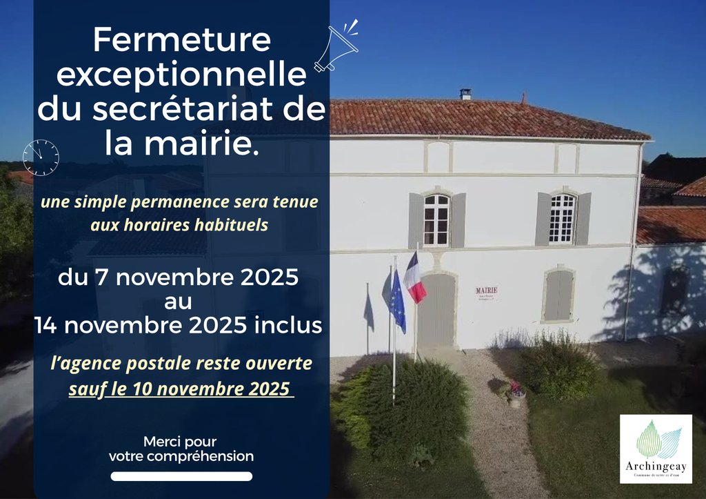 le secrétariat de la mairie sera fermé du vendredi 7 au 14 novembre 2025 inclus.