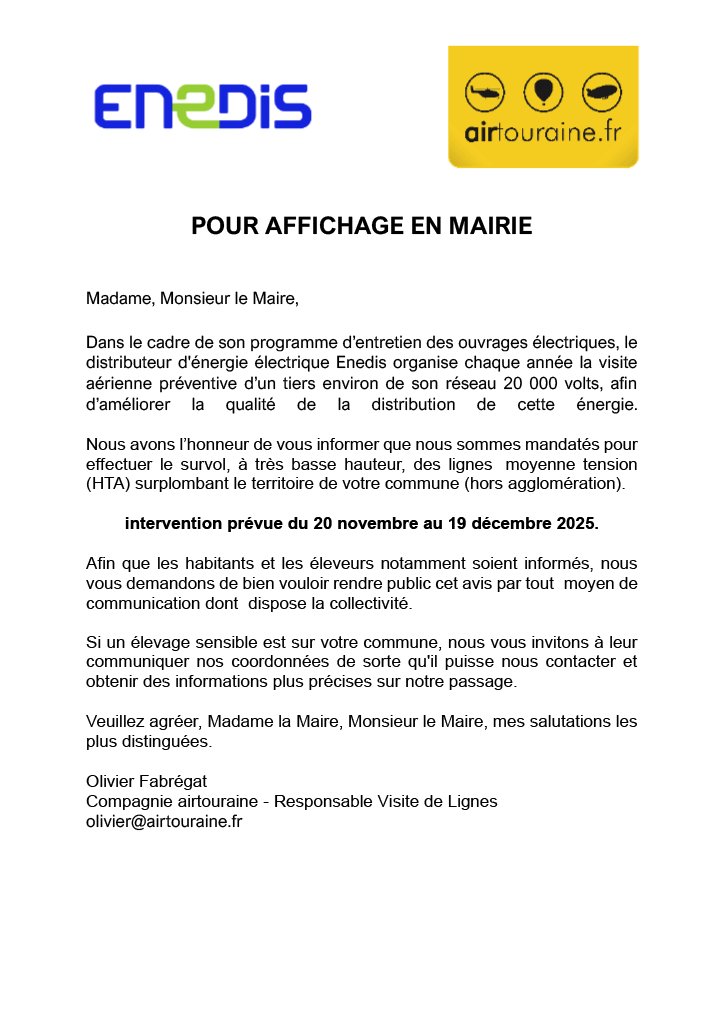 AirTouraine vous informe qu'ils sont mandatés pour effectuer le survol, à très basse hauteur, des lignes moyenne tension (HTA) surplombant le territoire de votre commune (hors agglomération).