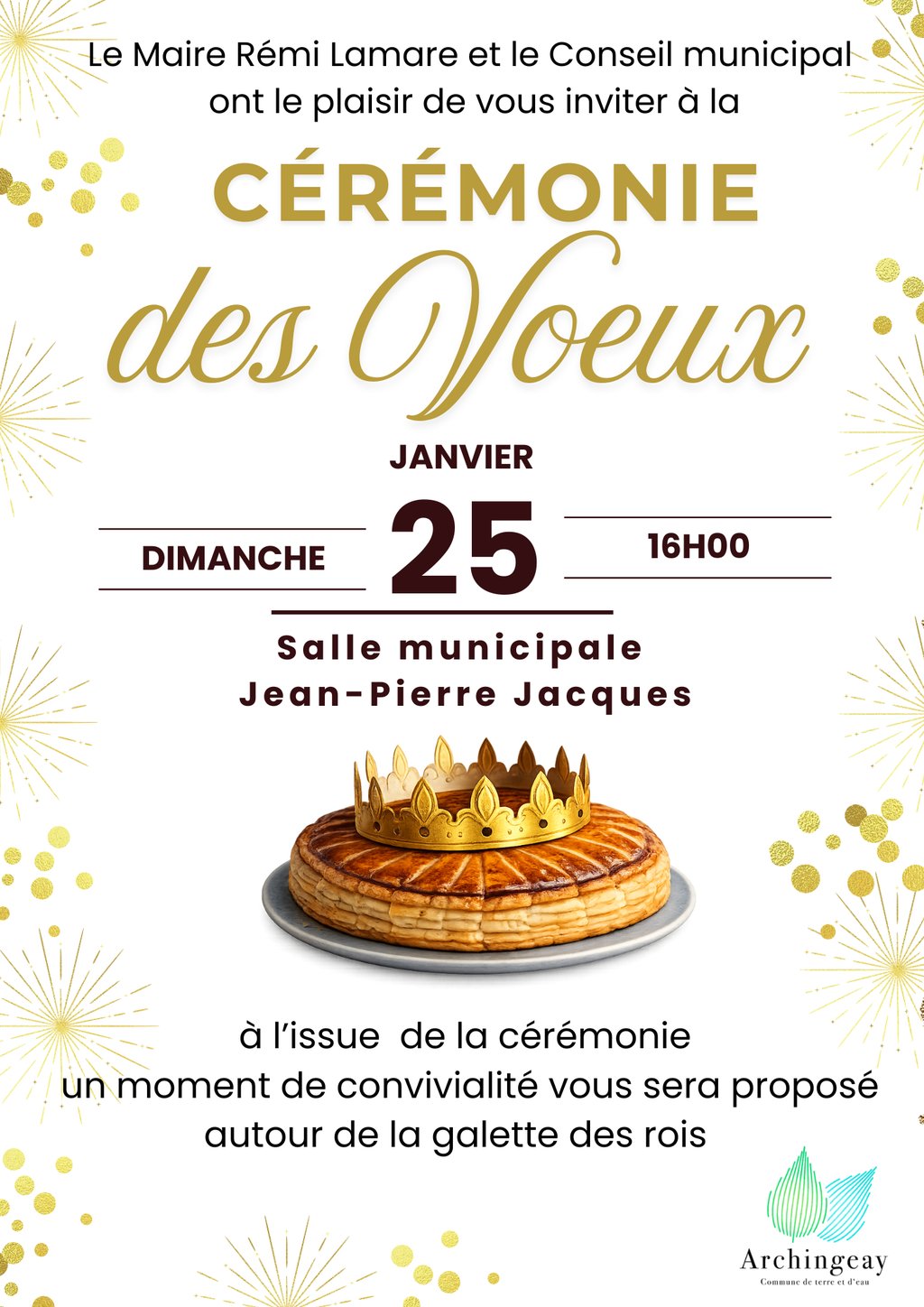 Monsieur le Maire Rémi Lamare et le Conseil municipal ont le plaisir de convier les habitants à la Cérémonie des Vœux.