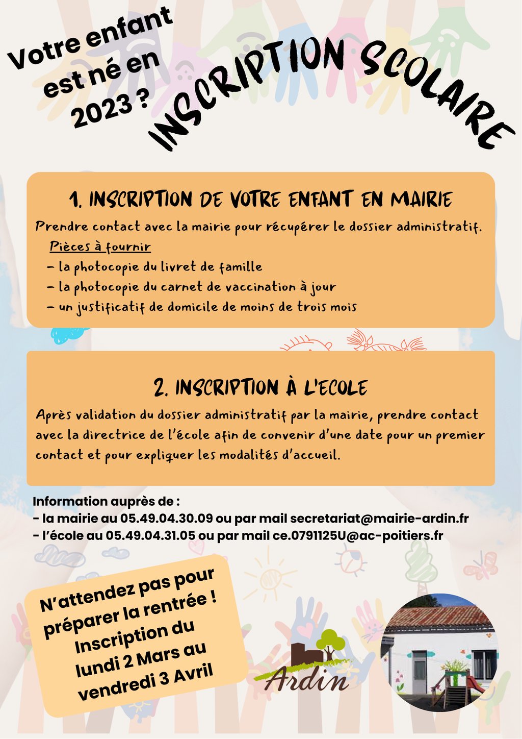 Les inscriptions scolaires pour la prochaine rentrée sont lancées. Vous pouvez contacter le secrétariat de mairie pour obtenir les modalités ou envoyer un mail à secretariat@mairie-ardin.fr