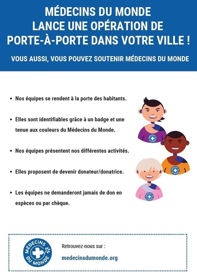 Médecins du Monde lance une campagne de porte-à-porte sur Arenthon durant le mois de mars. Les éléments permettant de reconnaitre les bénévoles sont mentionnés dans le visuel.