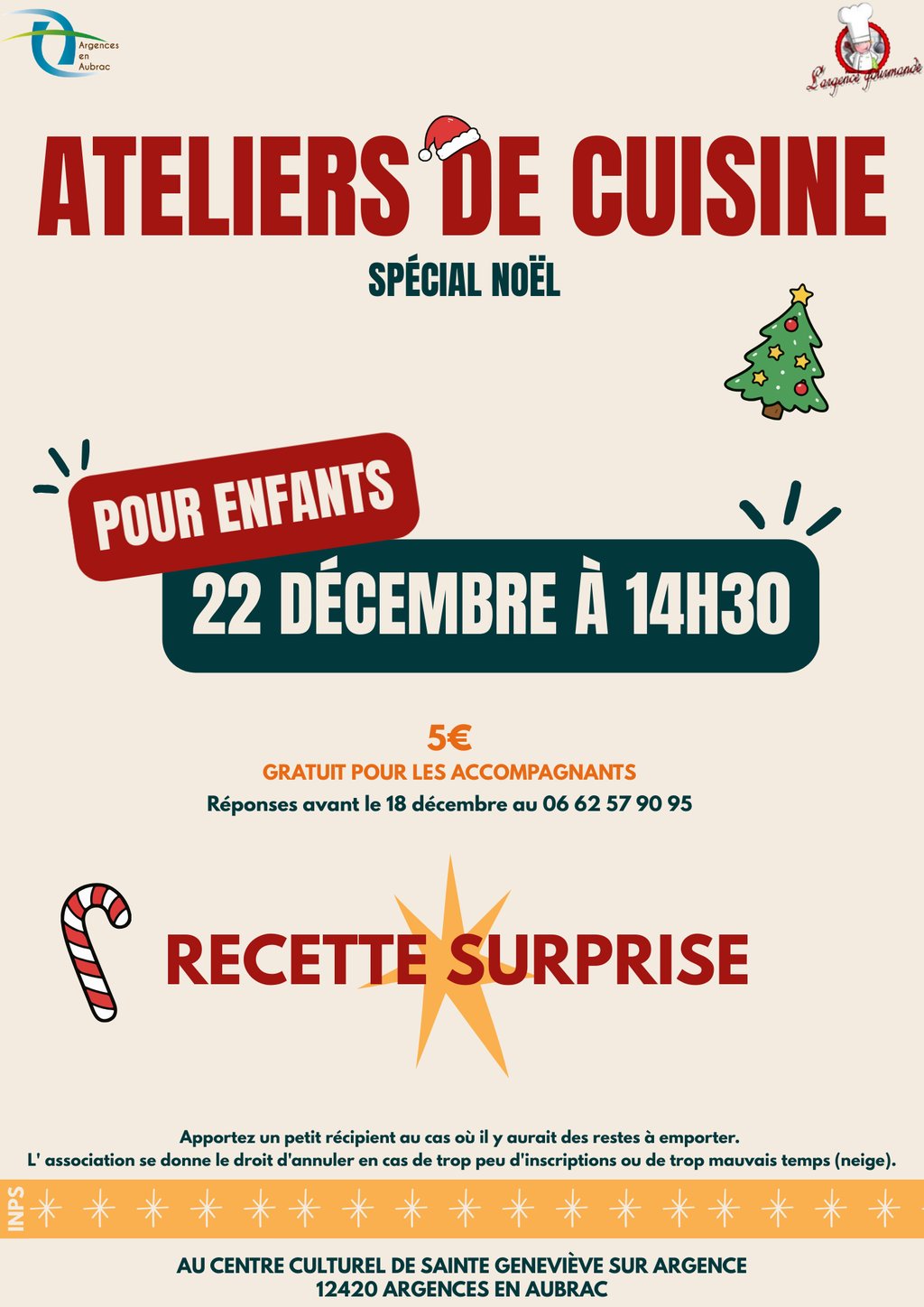 🎄 L'Argence Gourmande vous propose un atelier de cuisine spécial recette surprise de Noël pour enfants au centre culturel.