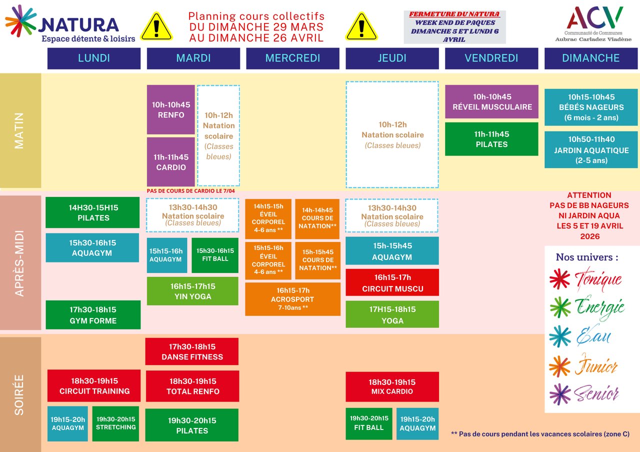 NATURA : MODIFICATION DU PLANNING DU 29 MARS AU 26 AVRIL / FERMETURE LES 5-6 AVRIL