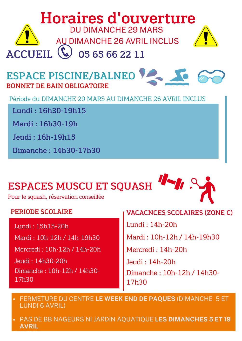 - annulation des créneaux de "bébés nageurs" et "jardin aquatique" le dimanche 19 avril 2026 (les espaces squash et musculation restent accessibles)