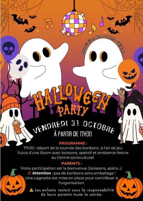A l’occasion d’Halloween, les parents d’élèves organisent une animation festive pour tous les enfants du village : Vendredi 31 octobre 2025 à partir de 17h30