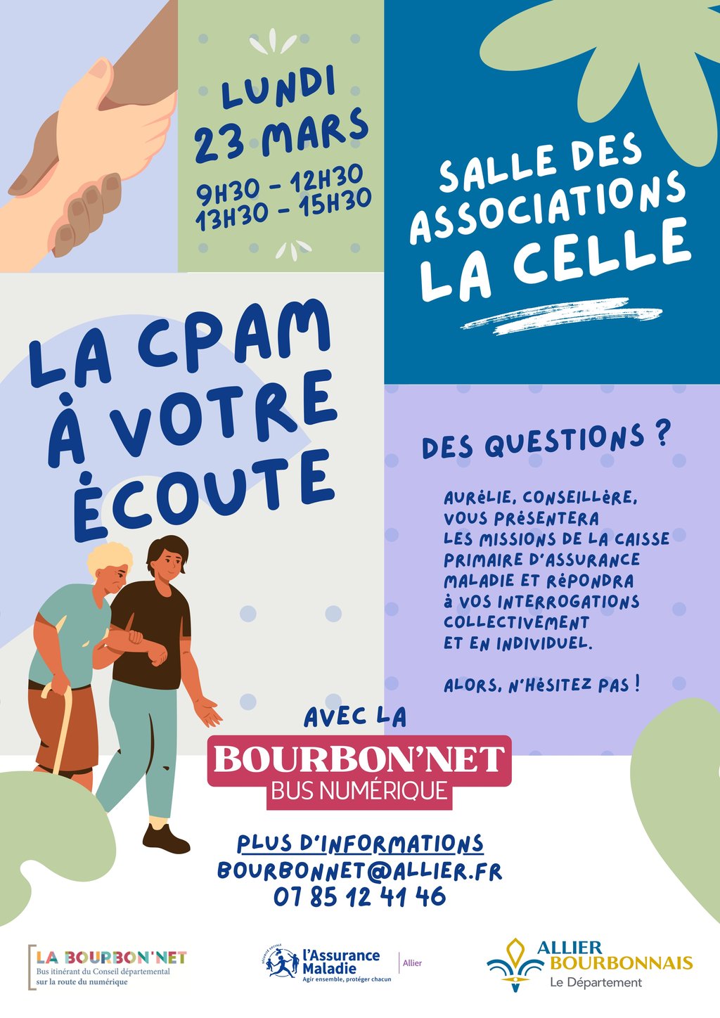 La Caisse primaire d'assurance maladie interviendra à La Celle le lundi 23 mars prochain pour répondre à toutes les questions des administrés. Cette initiative est exceptionnelle et ne se fera que dans deux communes de l'Allier (Valigny et La Celle).