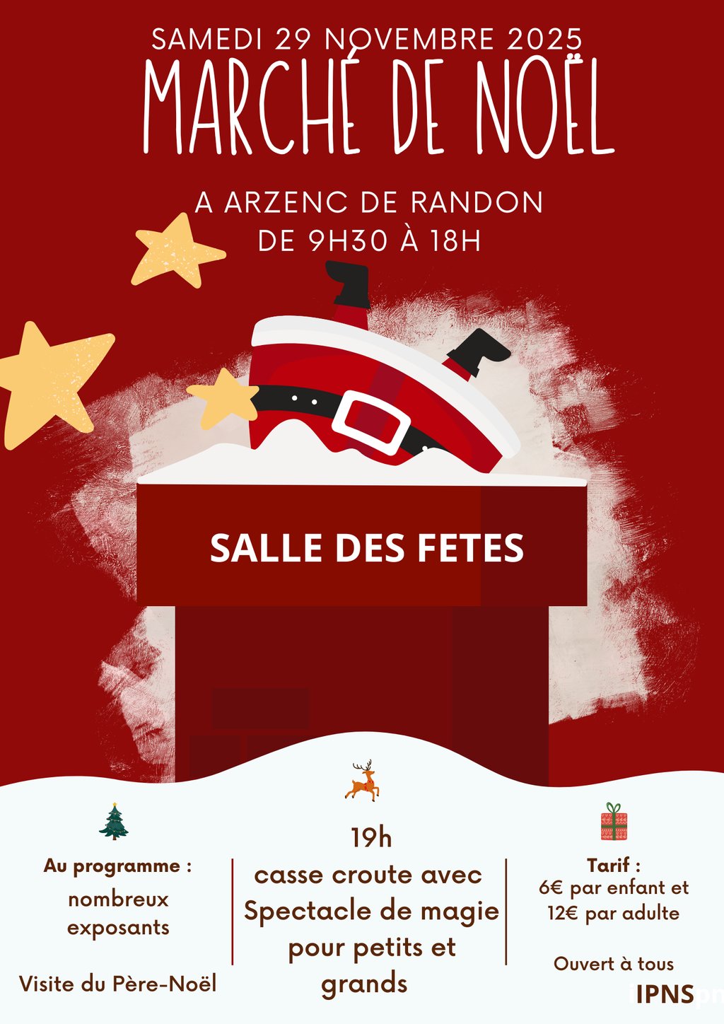Le Foyer rural d'Arzenc organise son Marché de Noël le samedi 29 novembre de 9h30 à 18h à la salle des fêtes d'Arzenc suivi d'un casse-croûte avec spectacle de magie pour petits et grands à 19h.