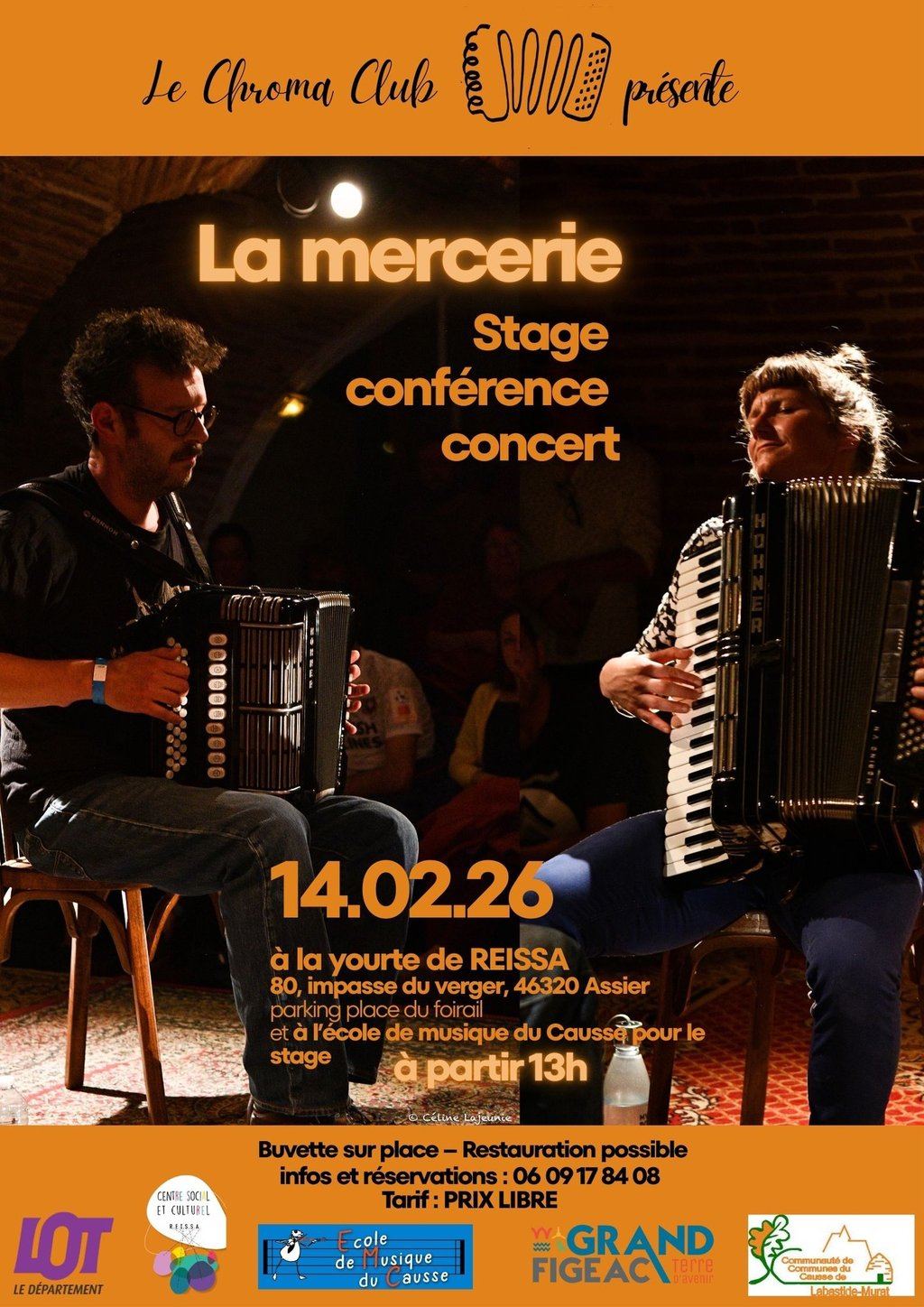 19 h Concert La Mercerie [boutons en tout genre] : Ensemble, Emilie et Antoine composent des pièces instrumentales où les boutons s'animent joyeusement pour laisser libre cours à leurs fantaisies musicales… Leur ligne de composition se base sur l'assemblage de motifs répétitifs qui mettent en relief les nombreuses possibilités sonores qu'offrent leurs accordéons Morino.
