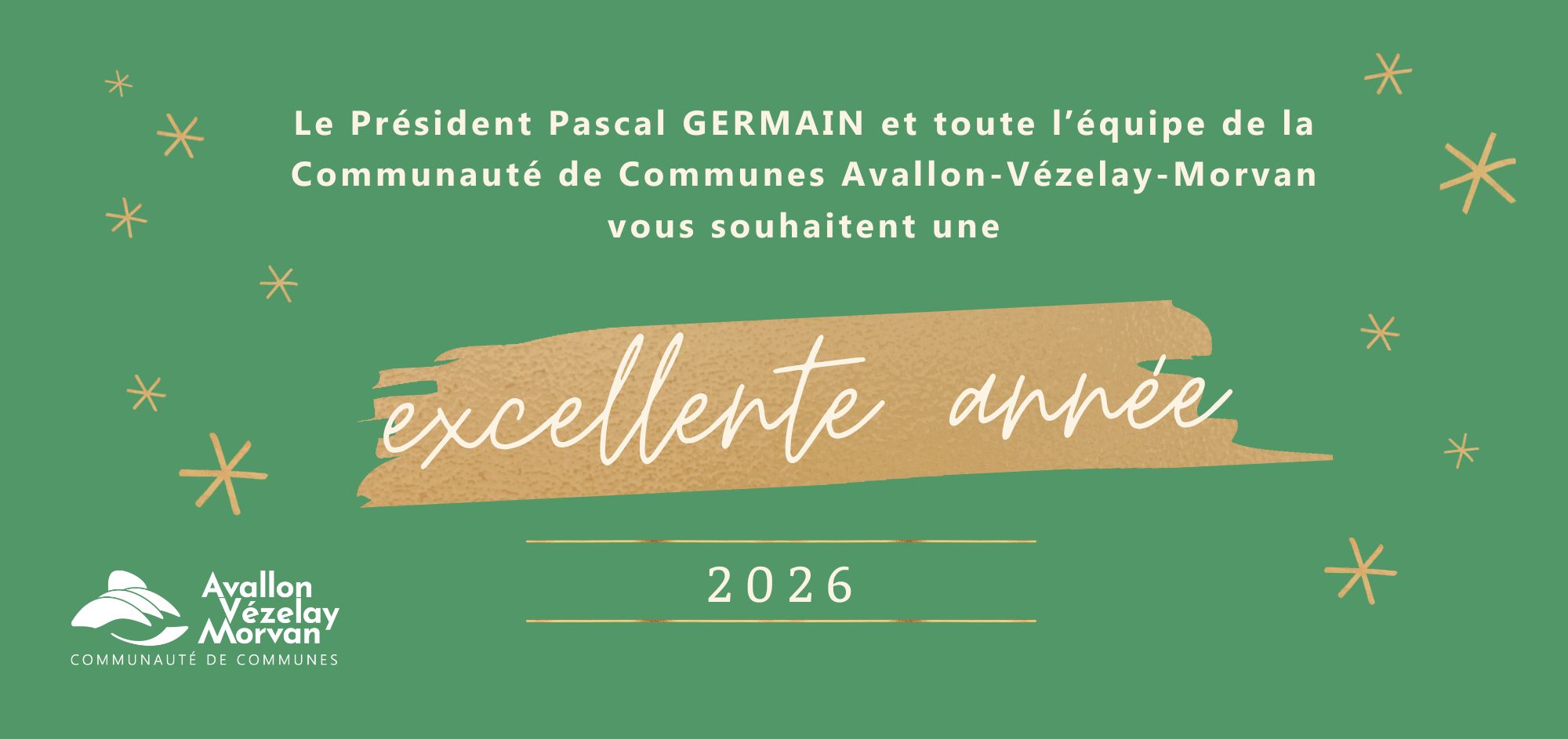 Le PrĂ©sident Pascal Germain et toute l'Ă©quipe de la CommunautĂ© de Communes Avallon-VĂ©zelay-Morvan vous transmettent leurs meilleurs vƓux de joie, santĂ© et rĂ©ussite dans vos projets pour 2026 🎉