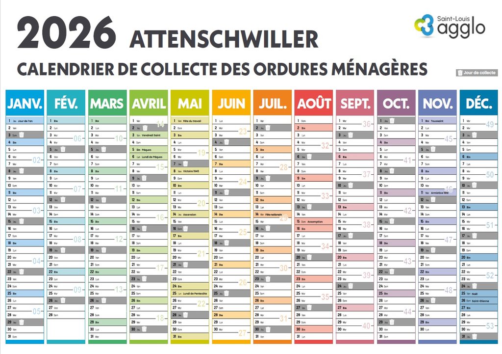 Veuillez trouver le calendrier de collecte des ordures ménagères pour l'année 2026.