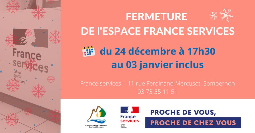 L'espace France services à Sombernon sera fermé du mercredi 24 décembre à 17h30 au samedi 03 janvier inclus.