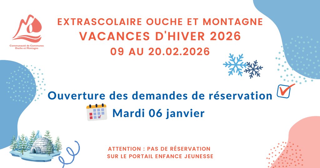 Parents, à vos agendas ! Les demandes de réservation pour les vacances d'hiver, du 09 au 20 février 2026 ouvrent mardi 06 janvier, en fin de journée. Vous recevrez un mail vous indiquant le lien de demande de réservation.