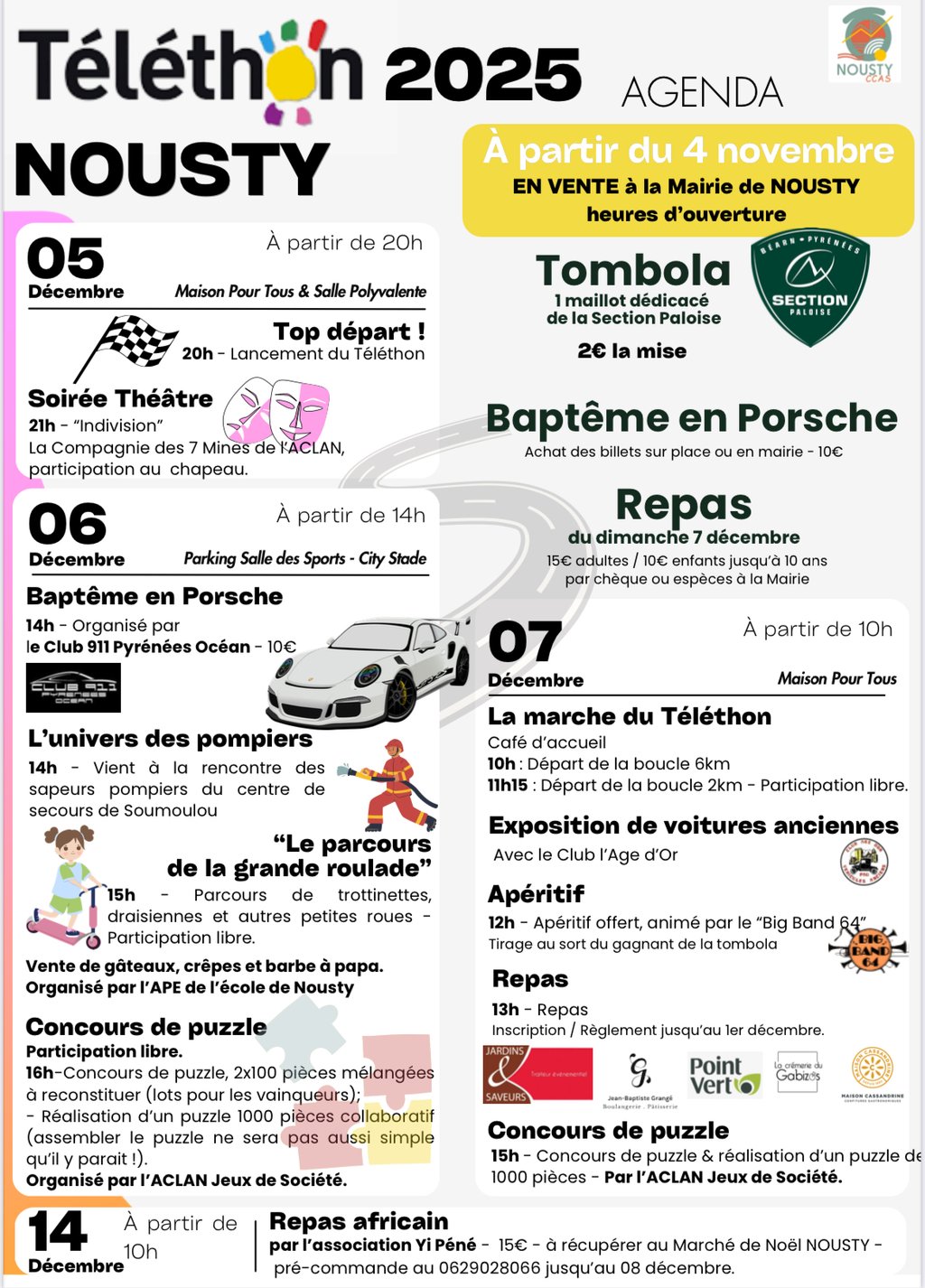 - samedi 6 décembre : la Grande Roulade organisée par l’APE, un concours de Puzzle, par la section des Jeux de Société de l’ACLAN, et des animations par les pompiers du centre de secours de Soumoulou;