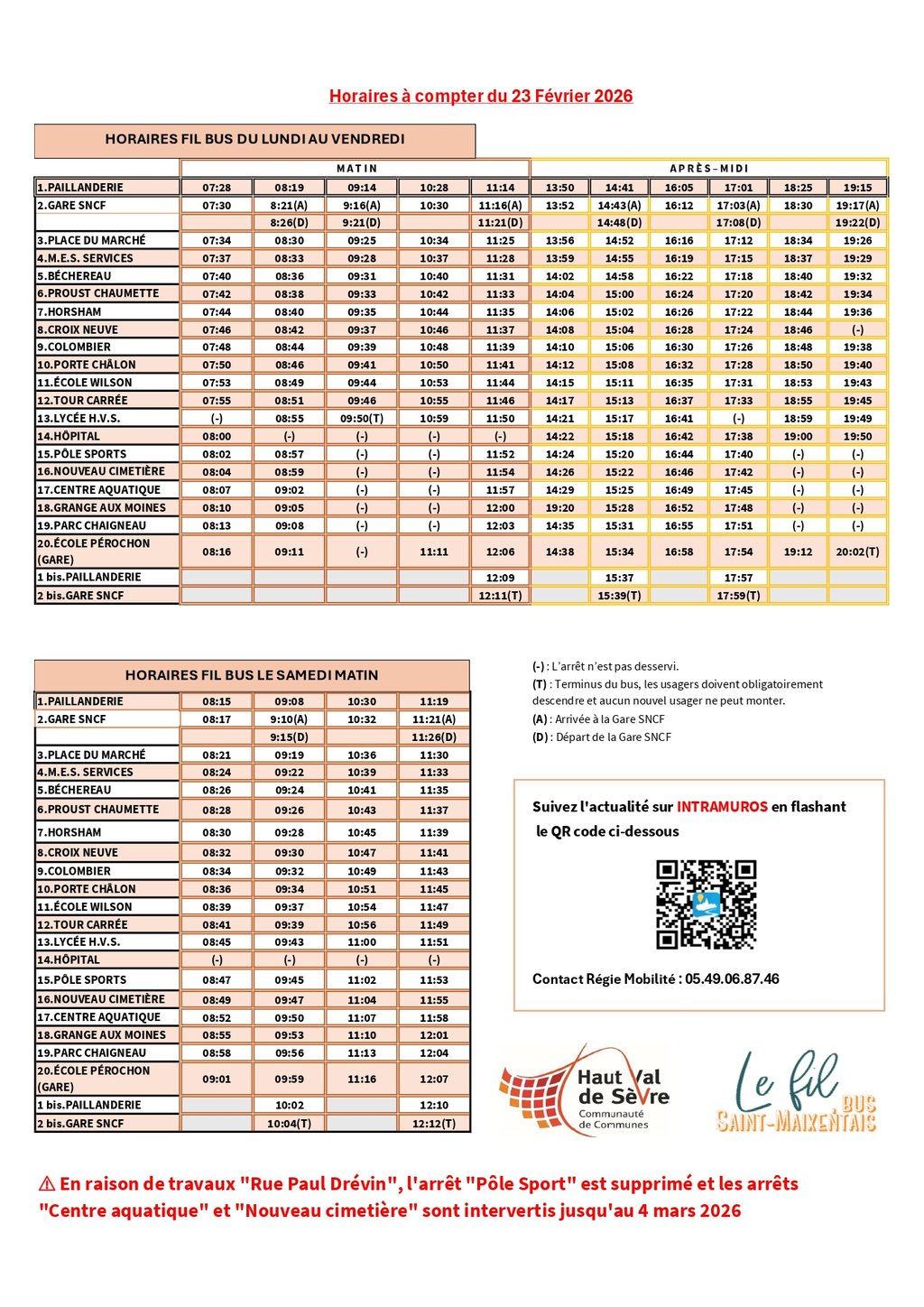 Ci-dessous, la fiche horaires Fil Bus à prendre en compte à partir du 23 février 2026. Cette fiche est disponible aux points d'arrêt et à la distribution dans le bus. Le circuit reste inchangé.