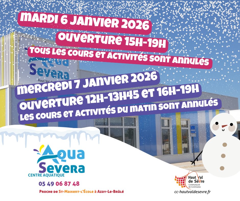 ❄️ Infos Centre Aquatique – Mardi 6 & Mercredi 7 janvier
