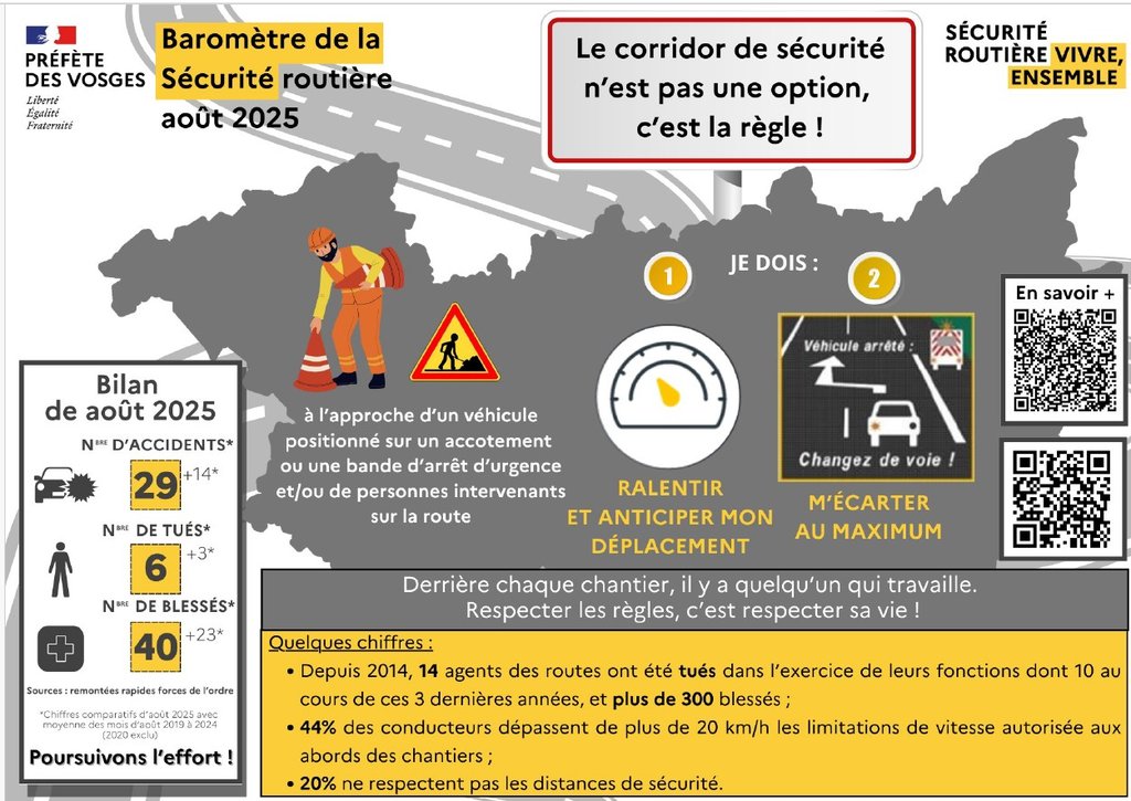 Le bureau de la sécurité routière donne, dans la photo ci-dessus ou le document joint, le baromètre catastrophique de la sécurité routière d'aout 2025 et fait un focus sur la conduite à tenir à l'approche d'un véhicule positionné sur un accotement ou une bande d'arrêt d'urgence et/ou de personnes intervenant sur la route.