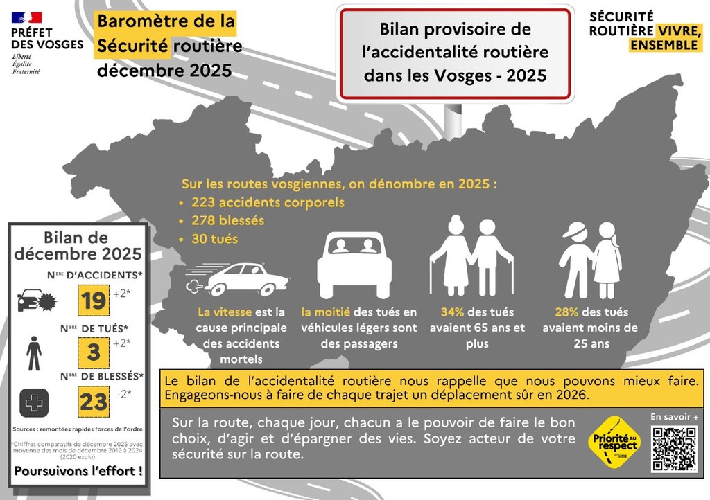 Le bureau de la sécurité routière donne, dans la photo ci-dessus, le baromètre de la sécurité routière de décembre 2025 et dresse le bilan de l'accidentalité routière, dans les Vosges, de l'année écoulée.