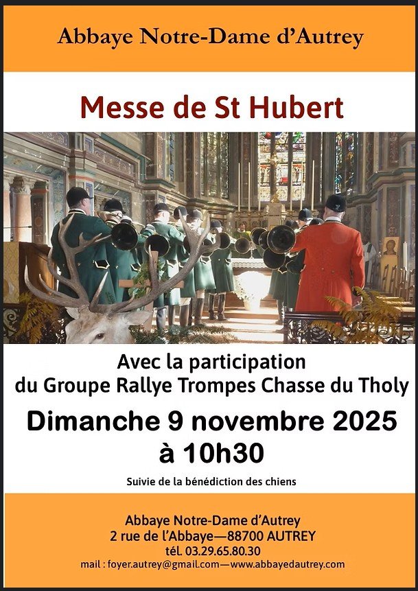 La messe de St Hubert aura lieu à l’abbatiale de l’abbaye Notre-Dame d’Autrey, le dimanche 9 novembre 2025 à 10h30, avec la participation du Groupe Rallye Trompes Chasse du Tholy.