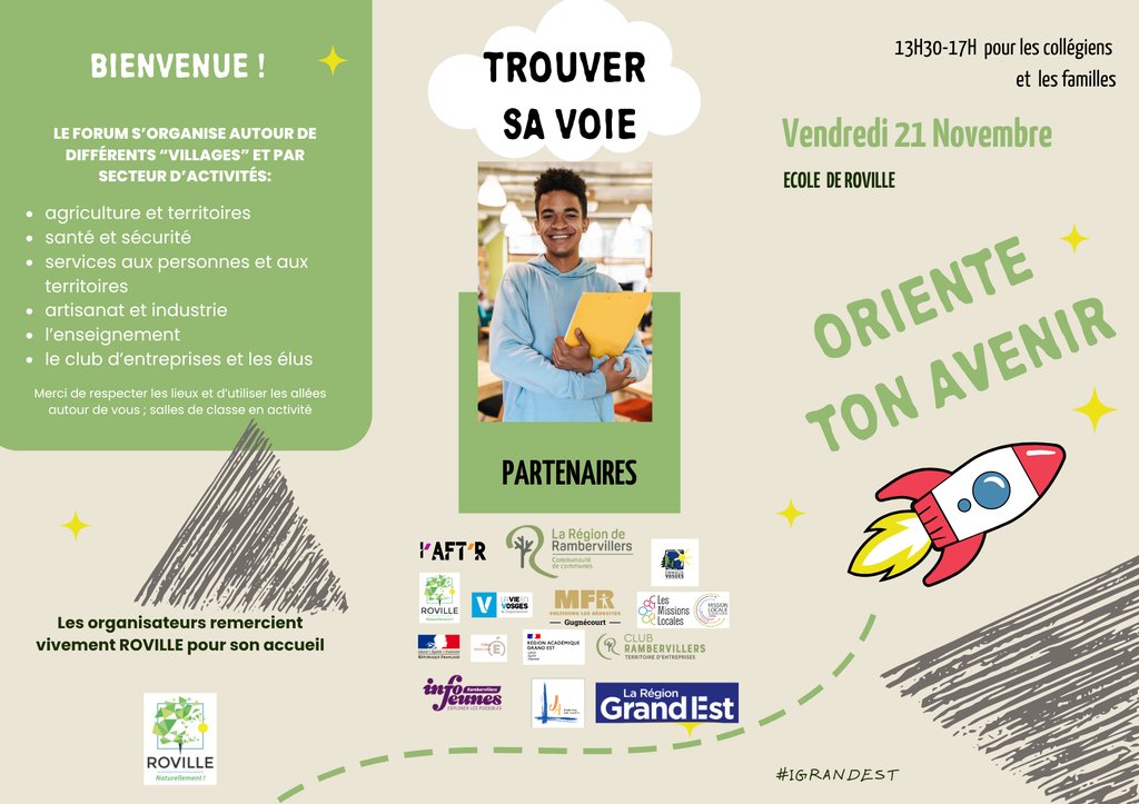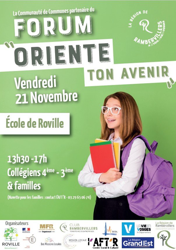 La Communauté de communes de la région de Rambervillers, le club d’entreprise de Rambervillers, les collèges Alphonse Cytère et Jeanne d’Arc, l’association des familles du territoire de Rambervillers, ROVILLE, la MFR de Gugnécourt et la Mission Locale du bassin d’emploi d’Épinal ont le plaisir de vous inviter au forum "Oriente ton avenir", qui se tiendra :