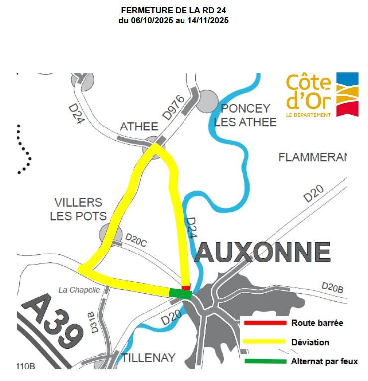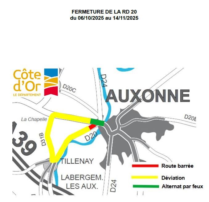 - Fermeture de l’accès à la route départementale RD20 (route de Tillenay) avec une déviation vers la RD31B (rue de la Chapelle à Villers-les-Pots)