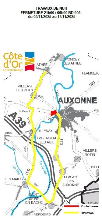 - Fermeture du pont de France et de la route départementale RD905 durant 3 nuits entre 21h et 6h avec une déviation vers les routes départementales RD24 (Saint-Seine-en Bâche) et RD31 (Les Maillys)