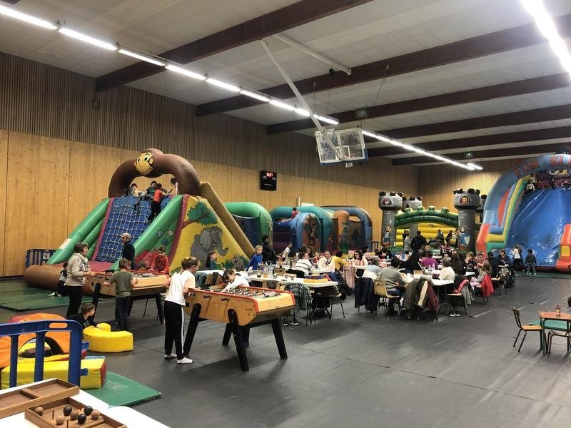 Parc de loisirs avec structures gonflables, baby-foot, jeux en bois, espace coloriage.