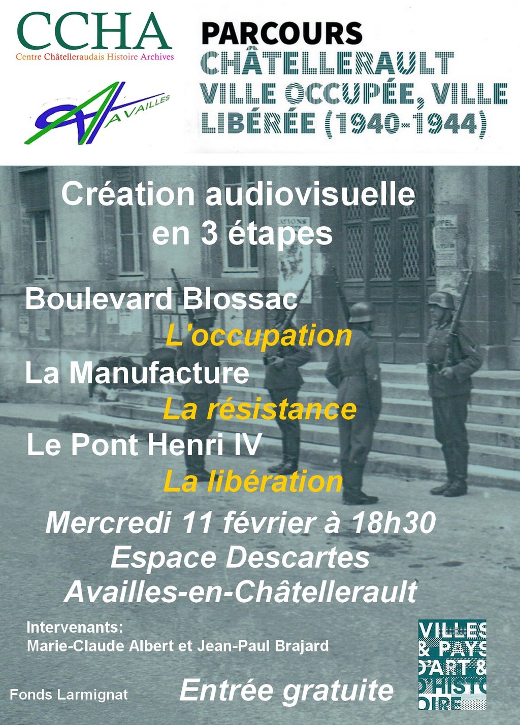 Création audiovisuelle du Centre Châtelleraudais Histoire et Archive (CCHA): réalisé à partir de documents d'archives et de témoignages, cette création mène le spectateur dans trois lieux emblématiques : sur le boulevard Blossac occupé, à la manufacture pôle de résistance,