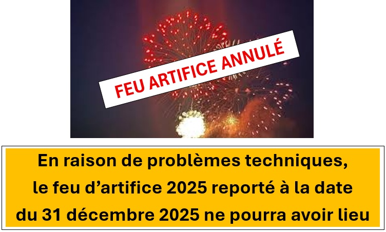 En raison de problèmes techniques, le feu d'artifice 2025 qui avait été reporté à la date du 31 décembre 2025 ne pourra avoir lieu.