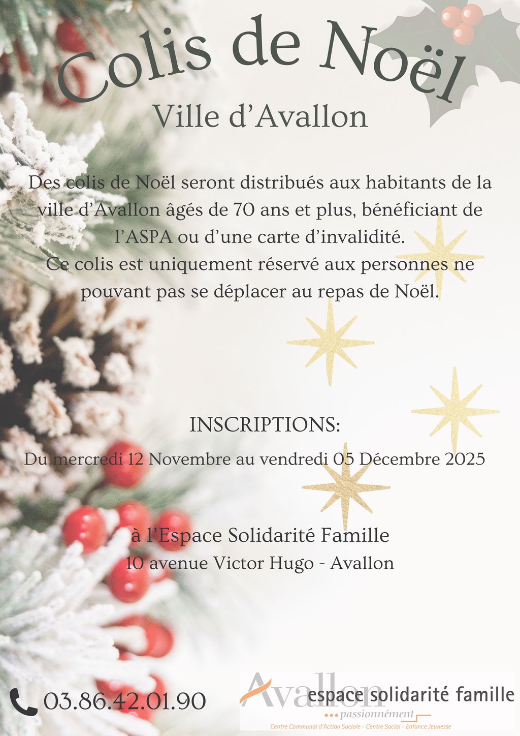 Pour les personnes âgées de plus de 70 ans ne pouvant pas se rendre au repas et bénéficiaire de l'Allocation Supplémentaire (FNS) ou d'une carte d'invalidité, contactez le CCAS au 03.86.42.01.90 pour recevoir un colis de Noël.