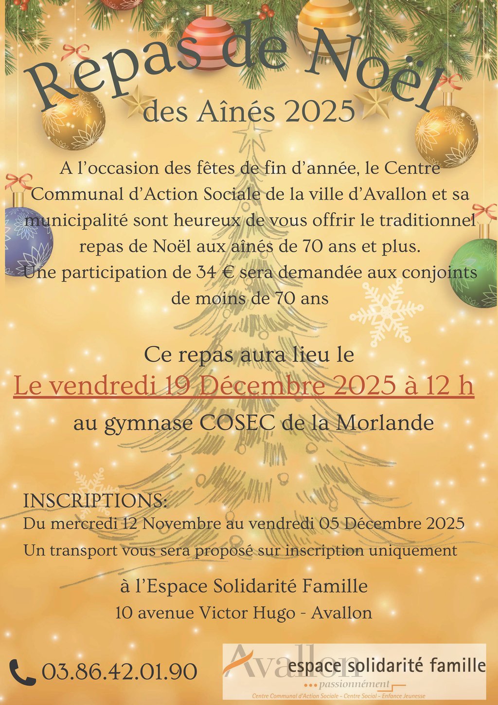 Comme chaque année, la municipalité et le CCAS de la Ville d'Avallon sont heureux d'offrir le traditionnel repas de Noël aux Avallonnais de 70 ans et plus !