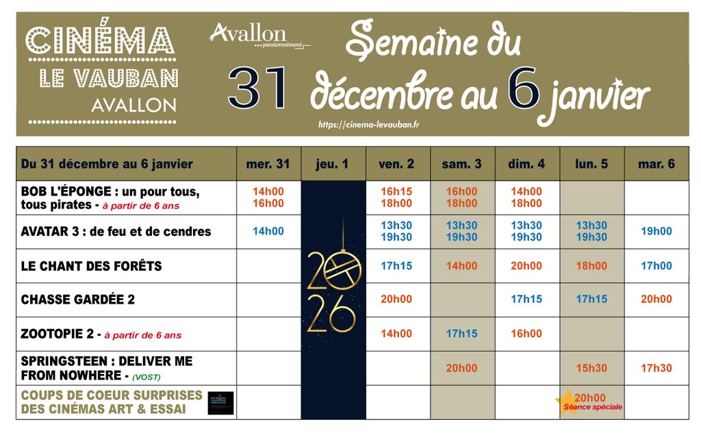 Au programme du 31 dĂ©cembre au 13 janvier au cinĂ©ma Le Vauban : Avatar 3 : de feu et de cendres, Le chant des forĂȘts, Springsteen : deliver me from nowhere, La Femme de MĂ©nage, La Condition... et bien d'autres !