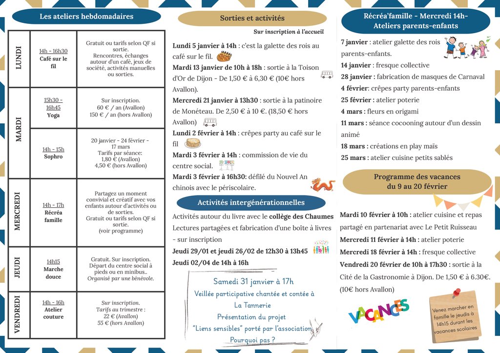 De janvier Ă mars, l'Ă©quipe du Centre Social vous propose de nombreuses activitĂ©s : sortie Ă la Toison d'Or, crĂȘpes party, atelier galette des rois, sortie Ă la CitĂ© de la Gastronomie de Dijon... et bien d'autres !