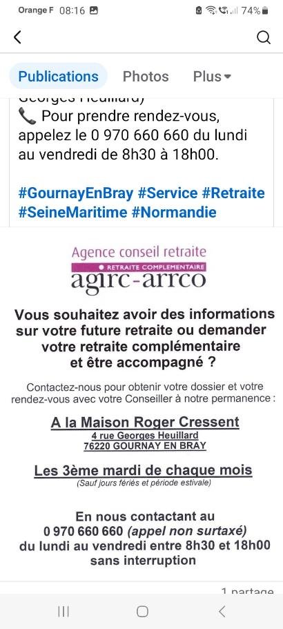 L'AGIRC-ARCCO, service retraite de Normandie, assure une permanence le 3ème mardi de chaque mois à la maison Roger Cressent , 4, rue Georges Heuillard à Gournay en Bray.