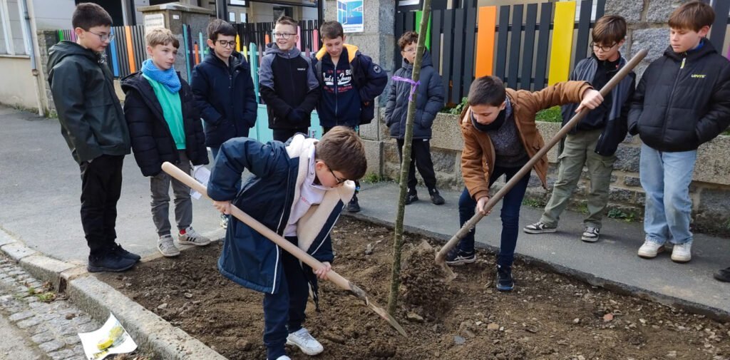 En remplacement des cerisiers malades du boulevard Amiral Gauchet, les agents des services de la Ville et les enfants de l’école Sainte Marie située à proximité ont installé 4 cytises et 2 robiniers.