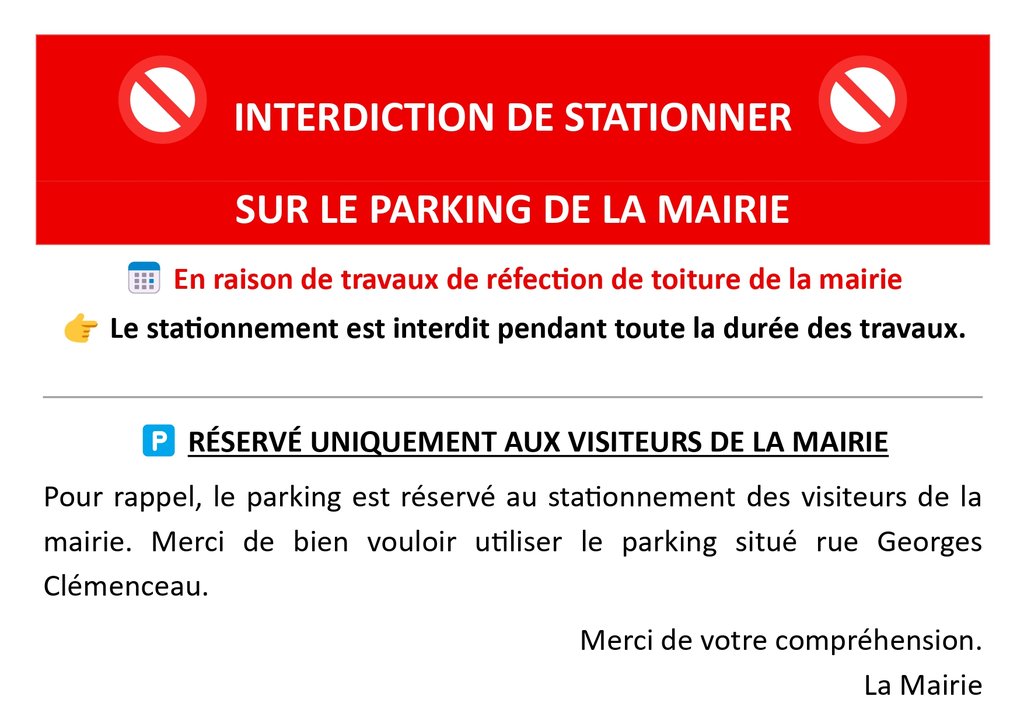 Nous vous informons qu'en raison des travaux de réfection de la toiture de la mairie, le stationnement sur le parking de la Mairie sera interdit pendant toute la durée des travaux.