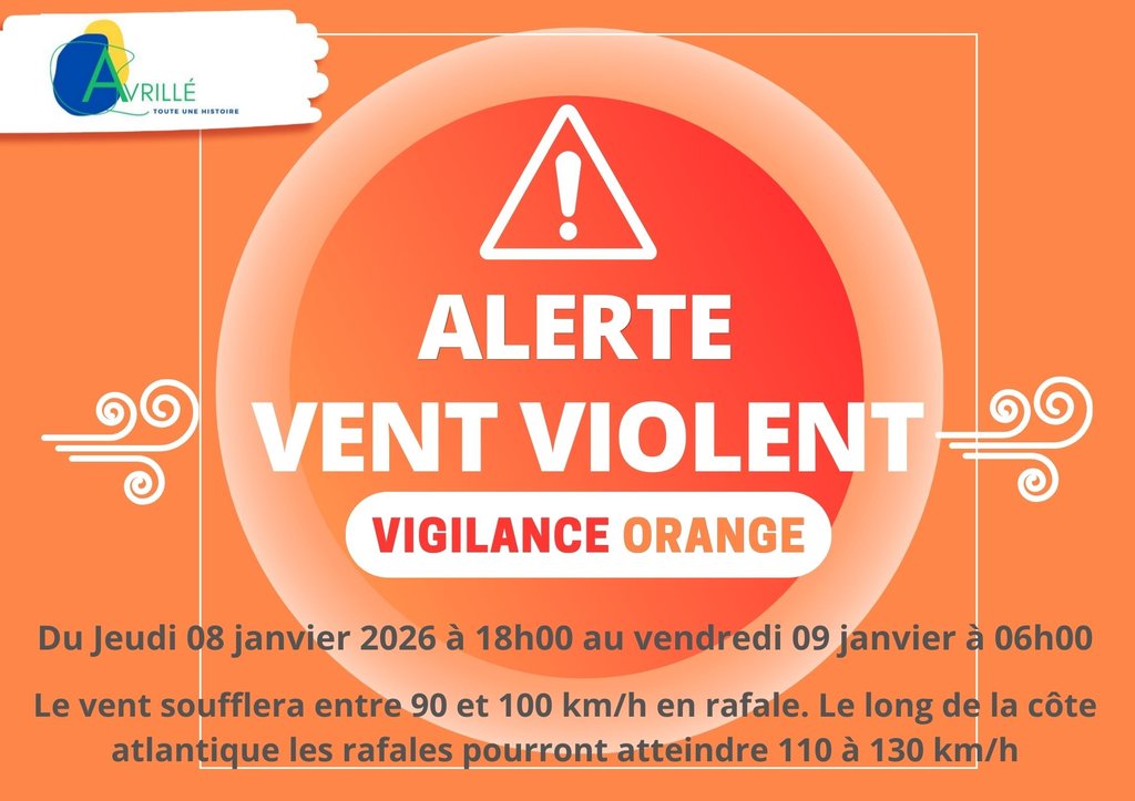 Le département de la Vendée est placé en vigilance orange vent violent du jeudi 08 janvier 2026 à 18h00 au vendredi 09 janvier 2026 à 06h00