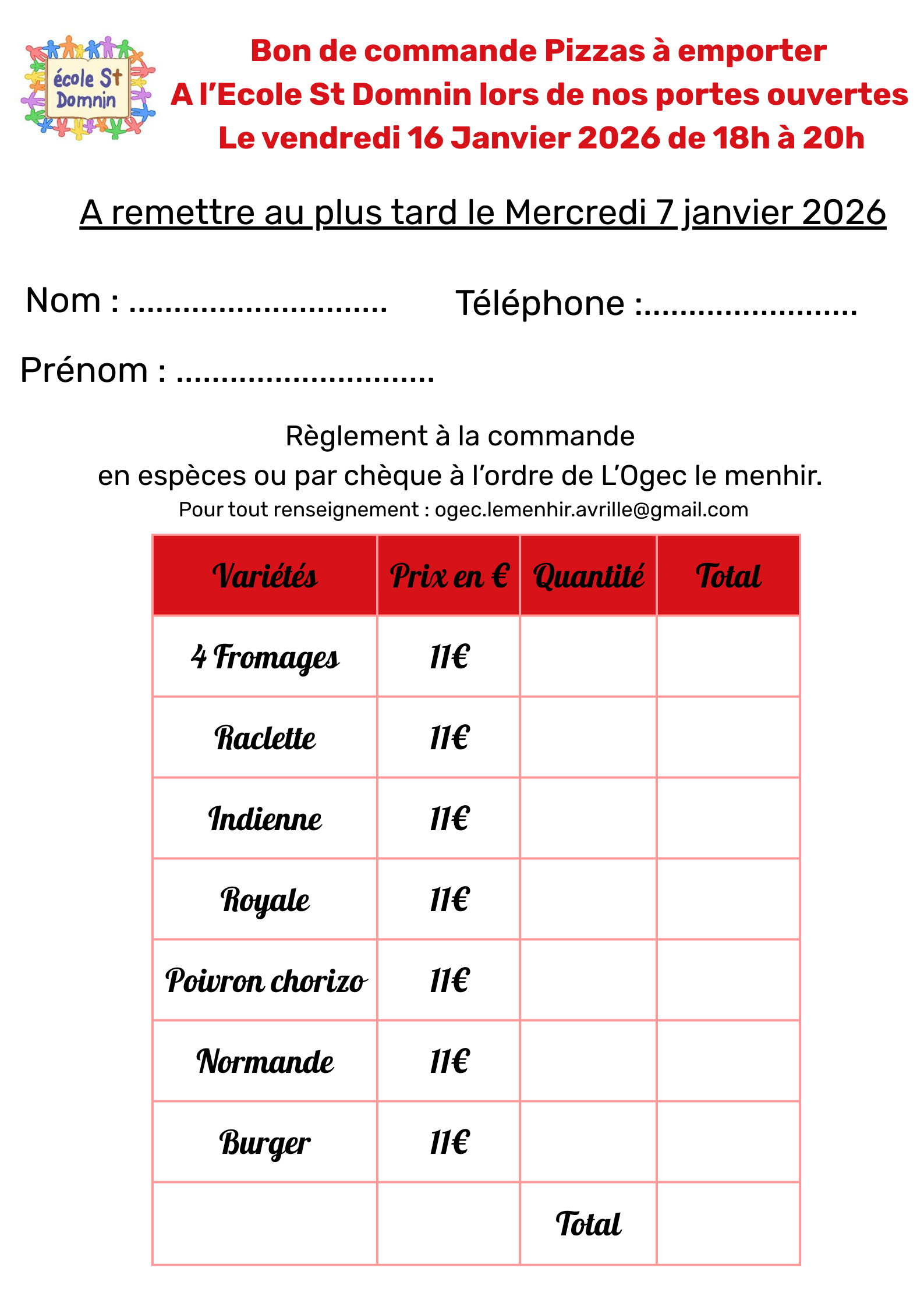 VENTE DE PIZZAS - OGEC LE MENHIR