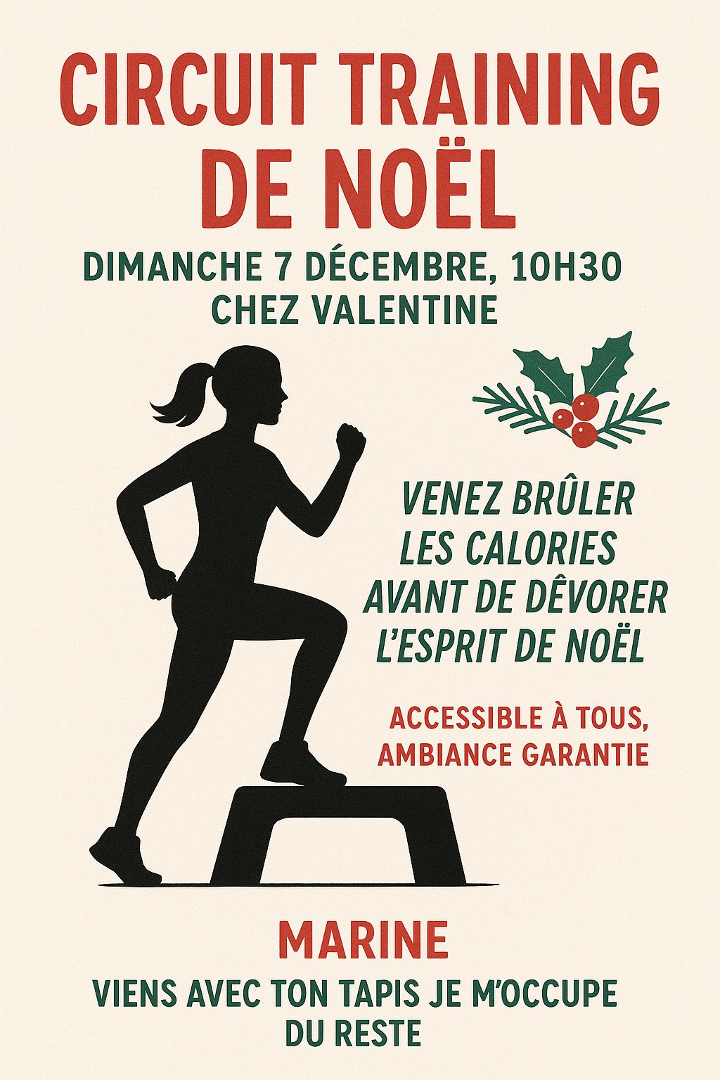 Marine CABANAT organise un circuit "Training de Noël", accessible à tous ; afin de bouger ensemble et partager un bon moment avant d'ouvrir les boites de chocolats😋