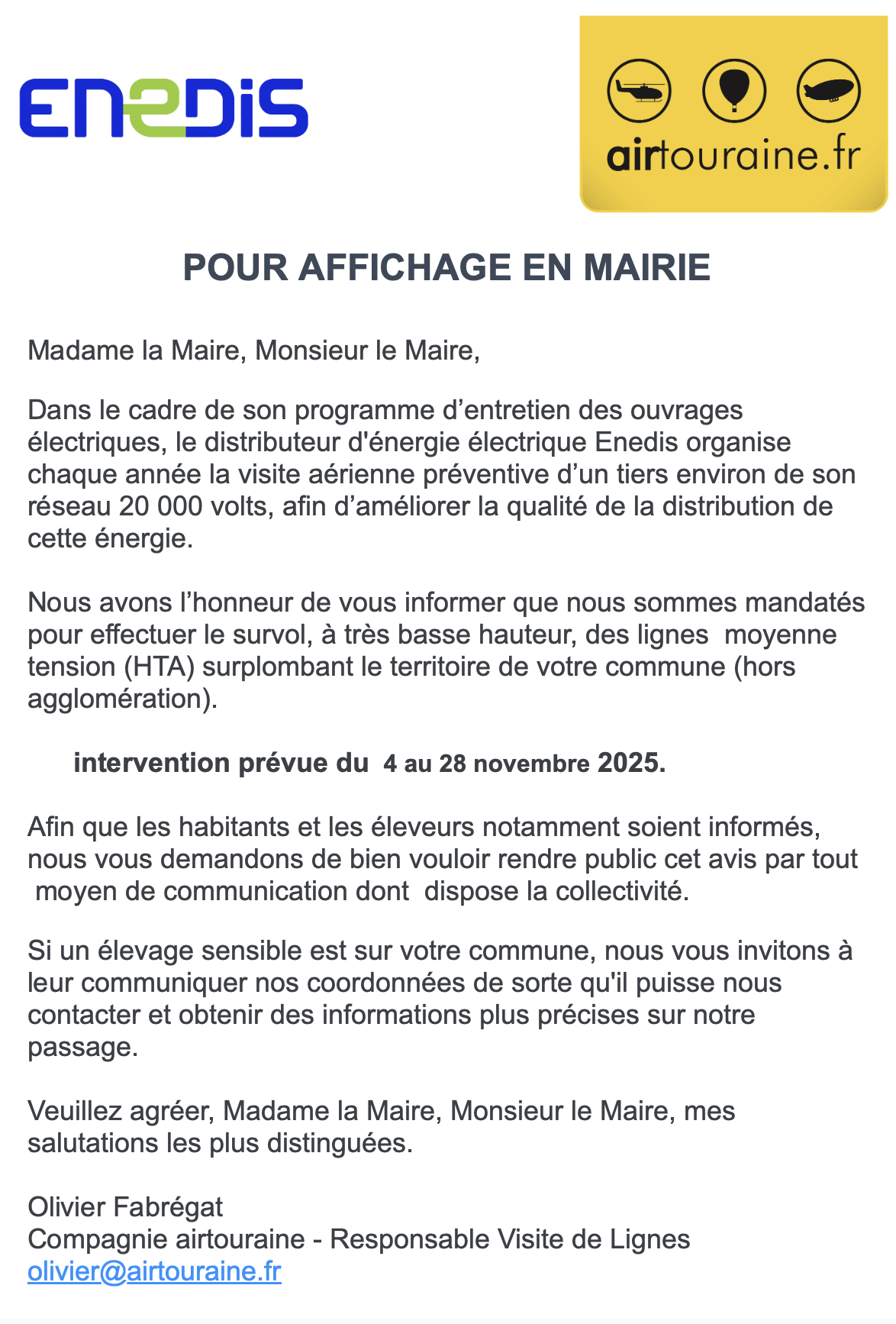 INFORMATIONS D'ENEDIS - INTERVENTION D'INSPECTION DES LIGNES MOYENNE TENSION (HTA) DU 4 AU 28 NOVEMBRE 2025