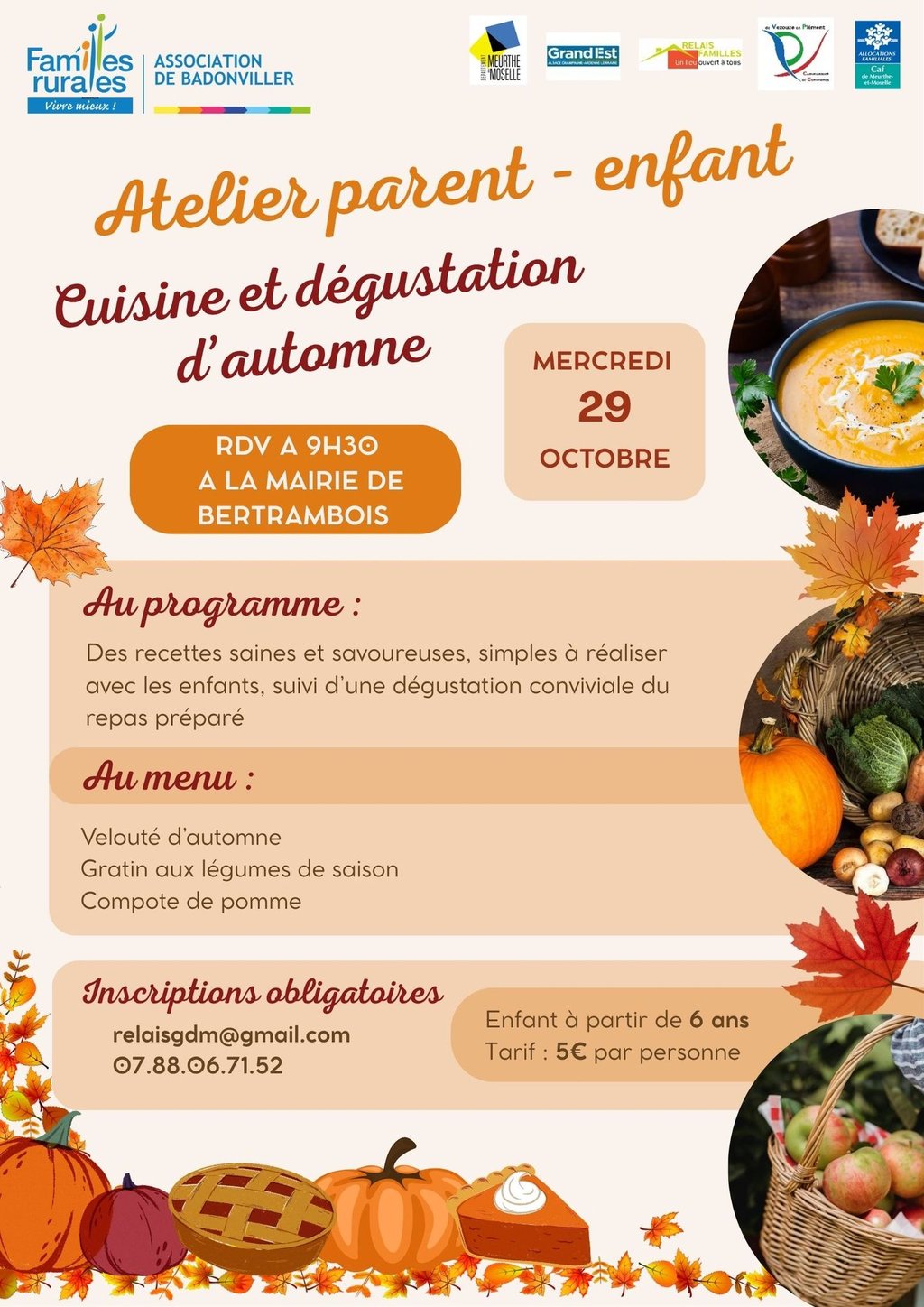 29/10 Atelier culinaire "Cuisine et dégustation d'automne" : pour les enfants à partir de 6 ans accompagnés d'un adulte.