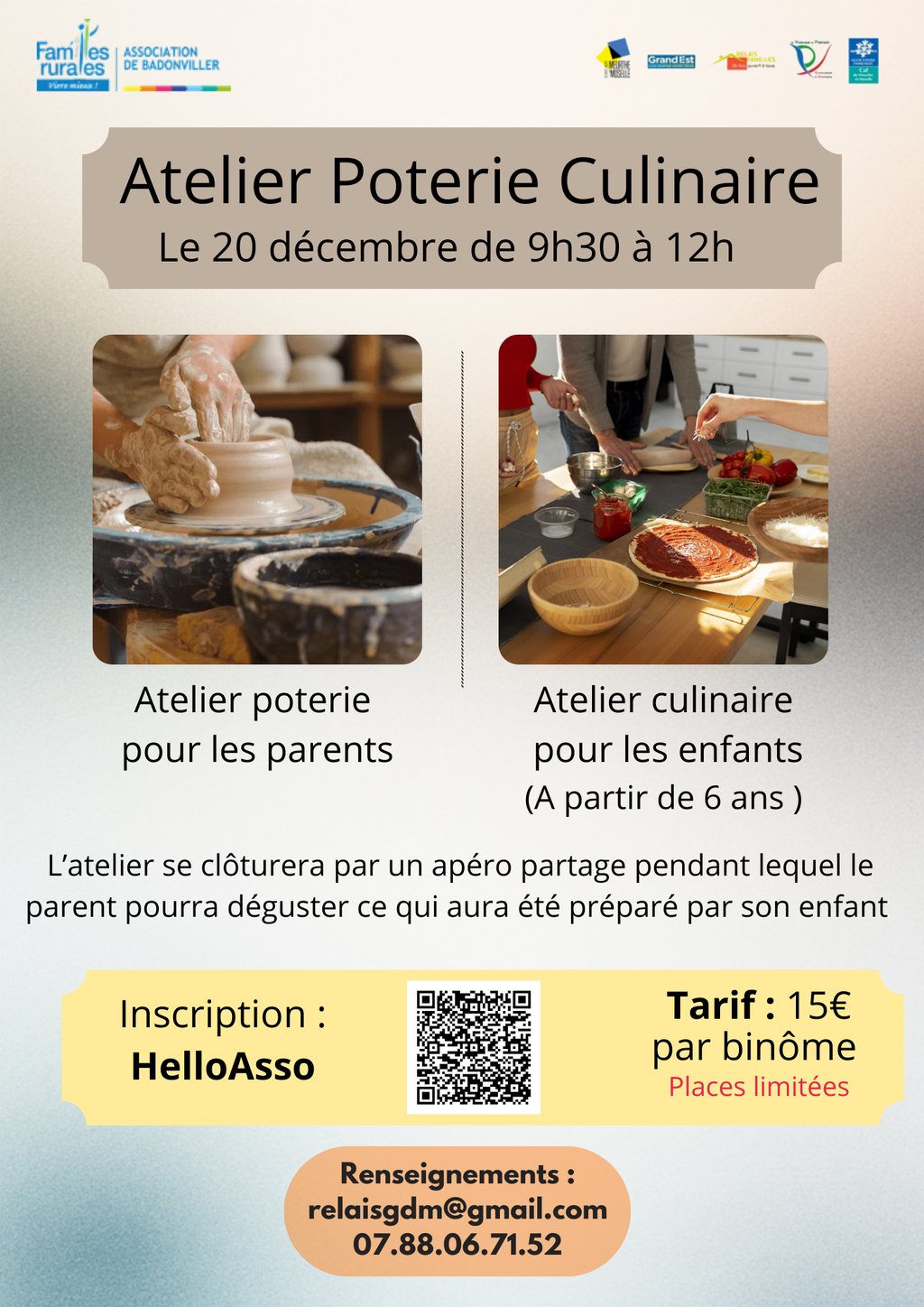 INSCRIPTION : Cliquez ici https://www.helloasso.com/associations/association-familles-rurales-de-badonviller/evenements/atelier-poterie-culinaire